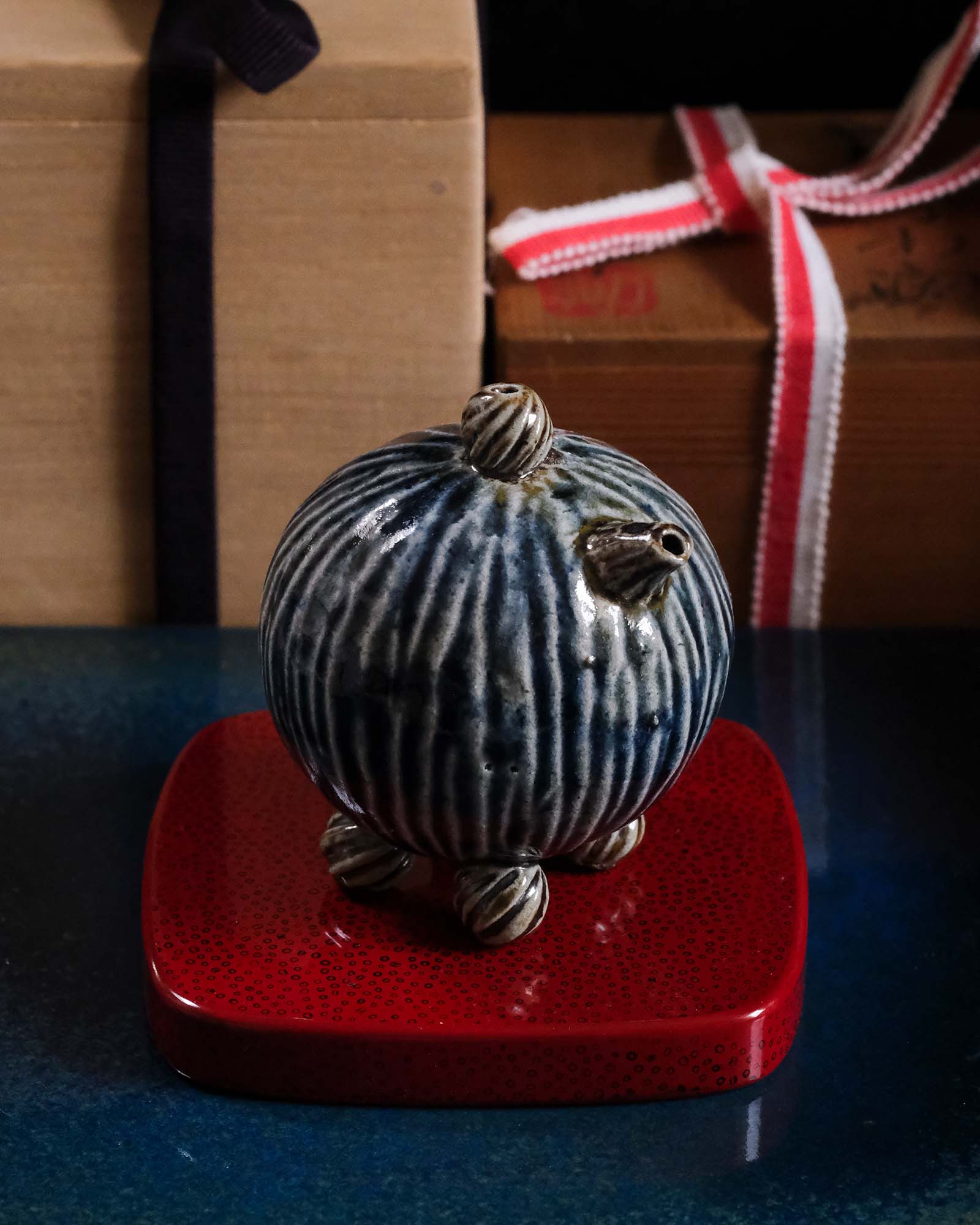 In East Asian calligraphy, the water dropper is not one of a scholar's four treasures. That honour is reserved for the brush, ink, paper and ink stone. Maybe it’s because the function of the water dropper can be easily replaced with any small water container whereas that of the four treasures can’t. However, I’m smitten with suiteki because they bring a silent joy to a calligrapher’s desk.