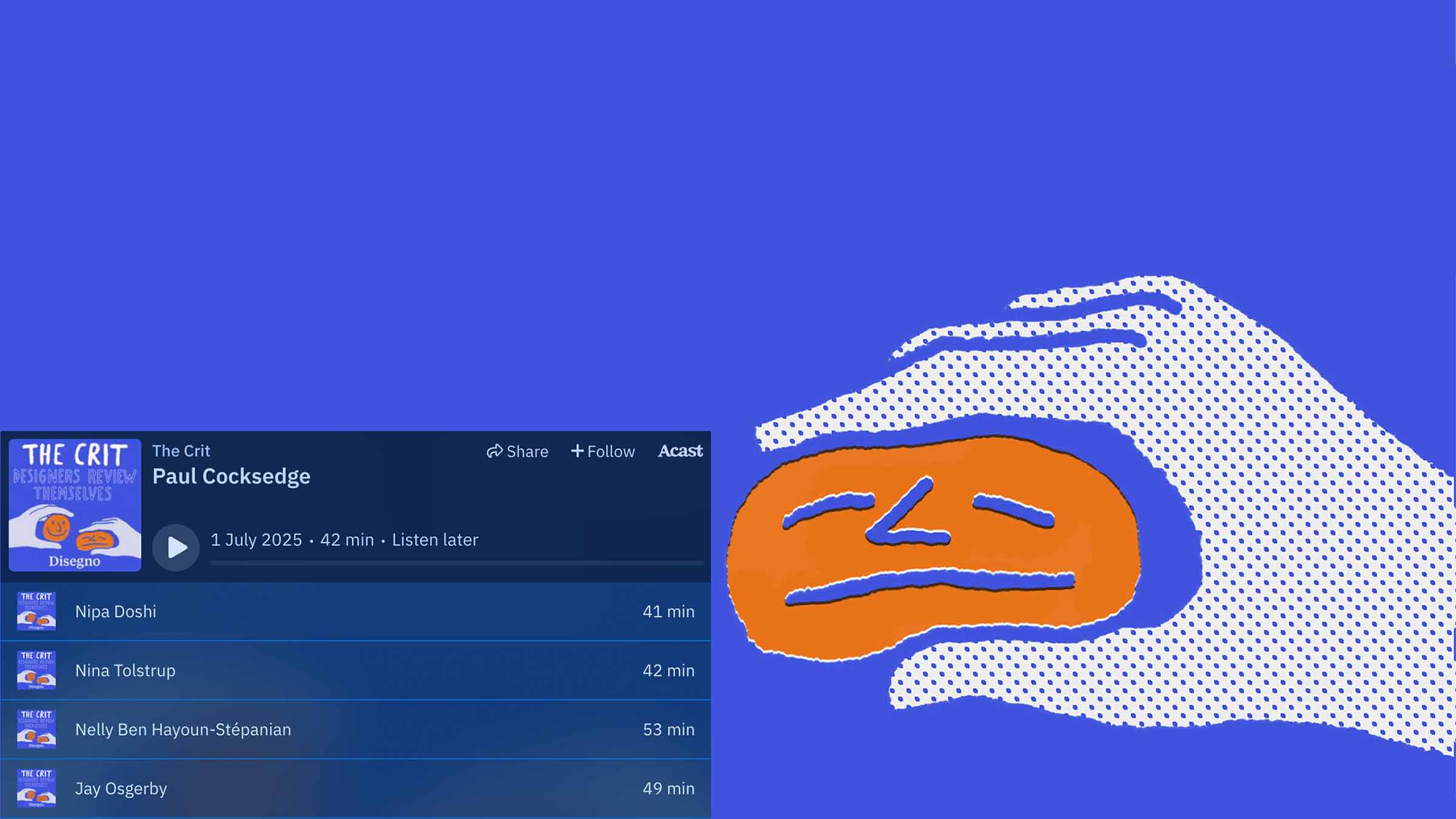 The Crit by Disegno is a podcast that “invites designers to review their own careers, picking out their highlights, lowlights and ambitions for the future”. Never banal, recent favourite episodes include Nipa Doshi, Nina Tolstrup and Jay Osgerby.